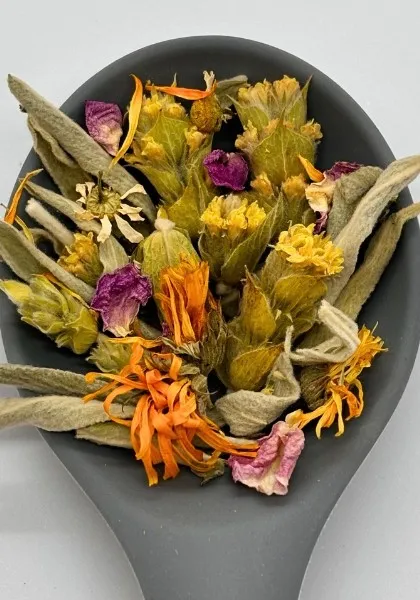 Ολόκληρα άνθη από τσάι του βουνού, ολόκληρα άνθη καλέντουλας, ροδοπέταλα και ολόκληρα άνθη χαμομηλιού.
