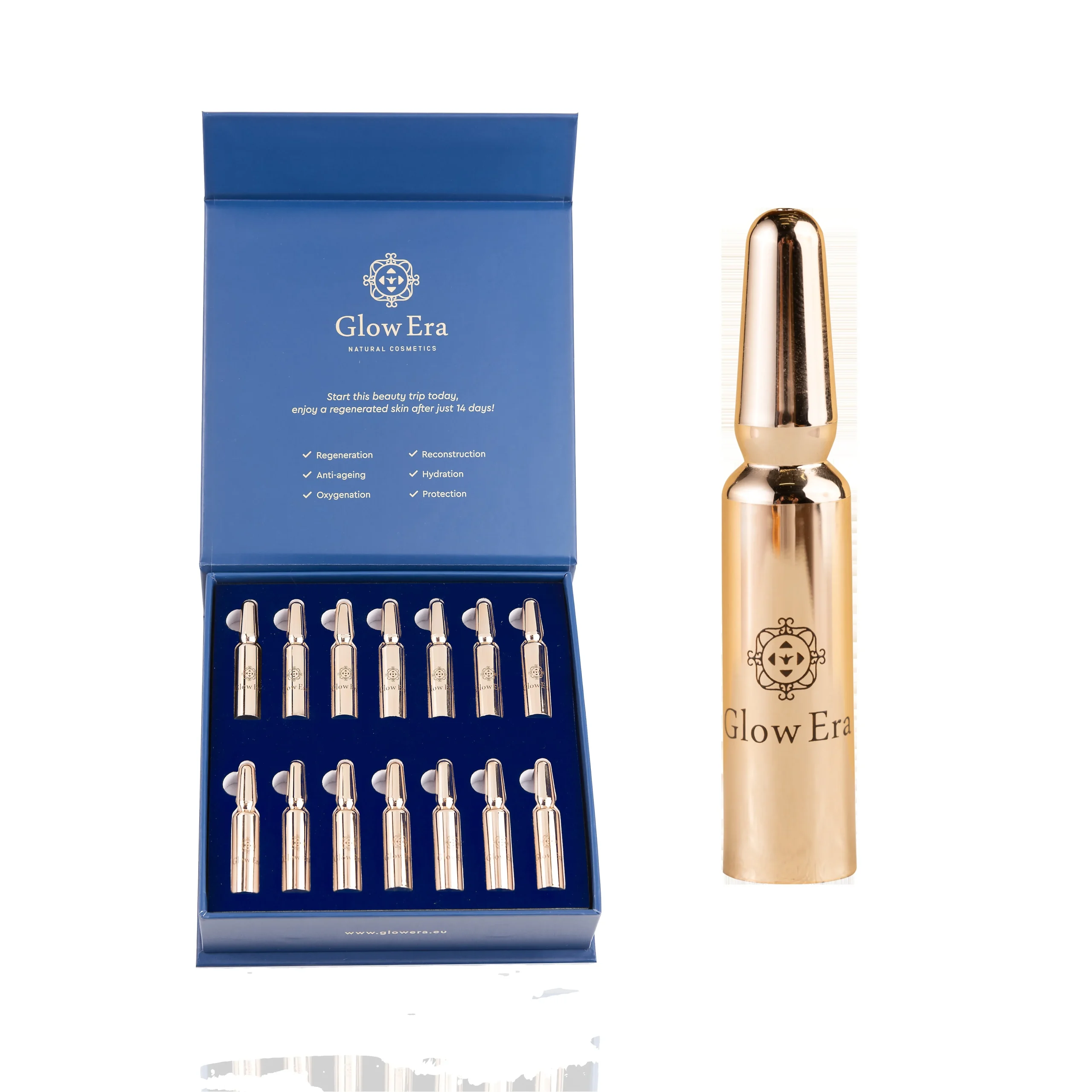 Ξεκινήστε σήμερα ένα αναζωογονητικό ταξίδι ομορφιάς με τις αμπούλες αντιγήρανσης προσώπου. Απολαύστε την πιο λαμπερή και σφριγηλή επιδερμίδα σας σε μόλις 14 ημέρες!»