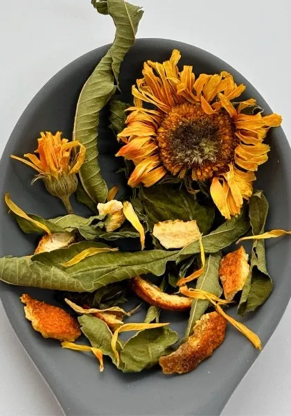 Ολόκληρα φύλλα Δυόσμου, ολόκληρα φύλλα Λουίζας, ολόκληρα άνθη Καλέντουλας και κομμάτια από φλούδα πορτοκαλιού.