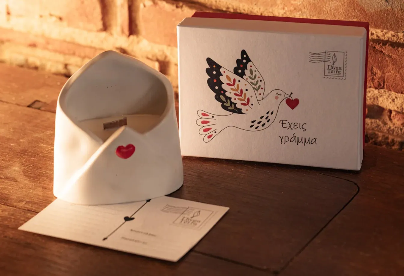 Το ειδικά σχεδιασμένο κουτί περιλαμβάνει χειροποίητο βάζο από οικολογική ρητίνη, με καρδιά ζωγραφισμένη στο χέρι, γεμάτο με 150γρ. κερί σόγιας, αρωματισμένο με Φράουλες ή με Μπισκότα και Κάρτα για να γράψετε τα ”ανείπωτα”.