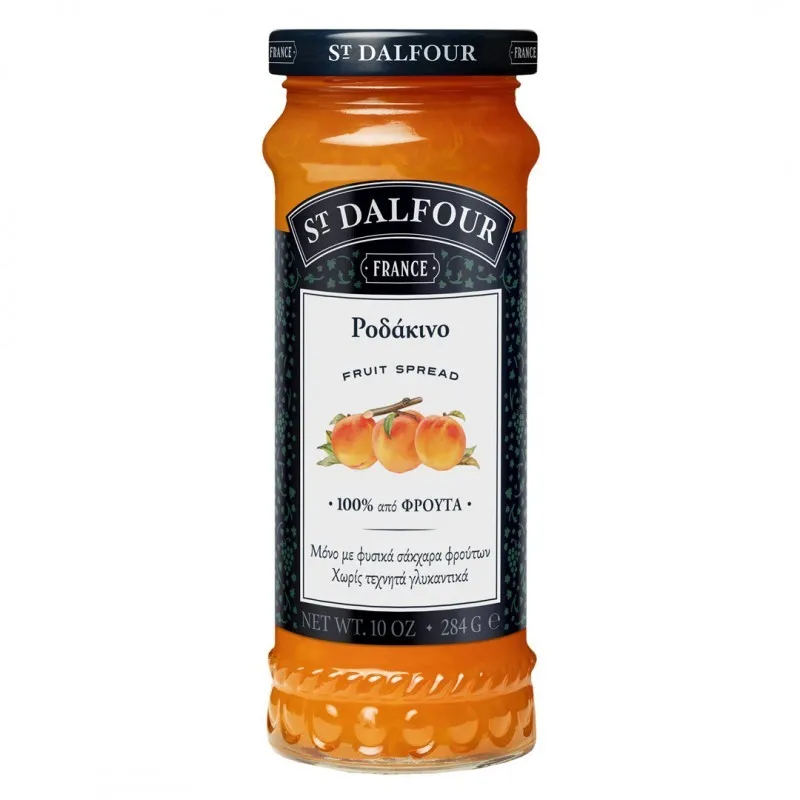 Η μαρμελάδα Ροδάκινο St. Dalfour παρασκευάζεται στην καρδιά της γαλλικής υπαίθρου, κοντά στην κατάφυτη περιοχή του Bordeaux, ακολουθώντας πιστά μια τοπική παραδοσιακή συνταγή 100 ετών, μόνο με φυσικά συστατικά, χωρίς πρόσθετα ή συντηρητικά. Φτιάχνεται 100% από φρούτα και η γλυκύτητα της προέρχεται μόνο από χυμούς σταφυλιών που ωριμάζουν φυσικά στους αμπελώνες της περιοχής.