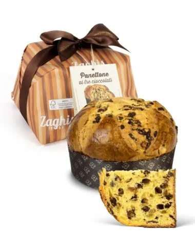 Αυτό το μοναδικό panettone της Zaghis είναι αφιερωμένο σε όσους δεν χορταίνουν τη σοκολάτα. Με λαχταριστή γέμιση από μαύρη, γάλακτος και λευκή σοκολάτα, προσφέρει τριπλή απόλαυση σε κάθε μπουκιά.