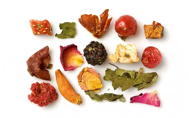 Λίστα Συστατικών: κομμάτια μήλου, κυνόροδο, άνθη ιβίσκου, μέντα, κομμάτια φράουλας, φραγκοστάφυλλο, βατόμουρο, δυόσμος, κομμάτια παντζαριού, σμέουρο, φύλλα μουριάς, άρωμα, πέταλα τριαντάφυλλου