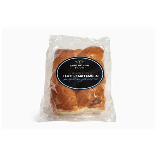 Το χειροποίητο τσουρεκάκι διπλό με γέμιση πραλίνας Chrisanthidis Delights συνδυάζει την παραδοσιακή ελληνική συνταγή τσουρεκιού με μια απολαυστική σοκολατένια γέμιση πραλίνας φουντουκιού.