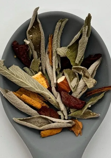 Ολόκληρα φύλλα φασκόμηλου, κομμάτια κανέλας Κεϋλάνης, μήλου, αμύγδαλου και παντζαριού.